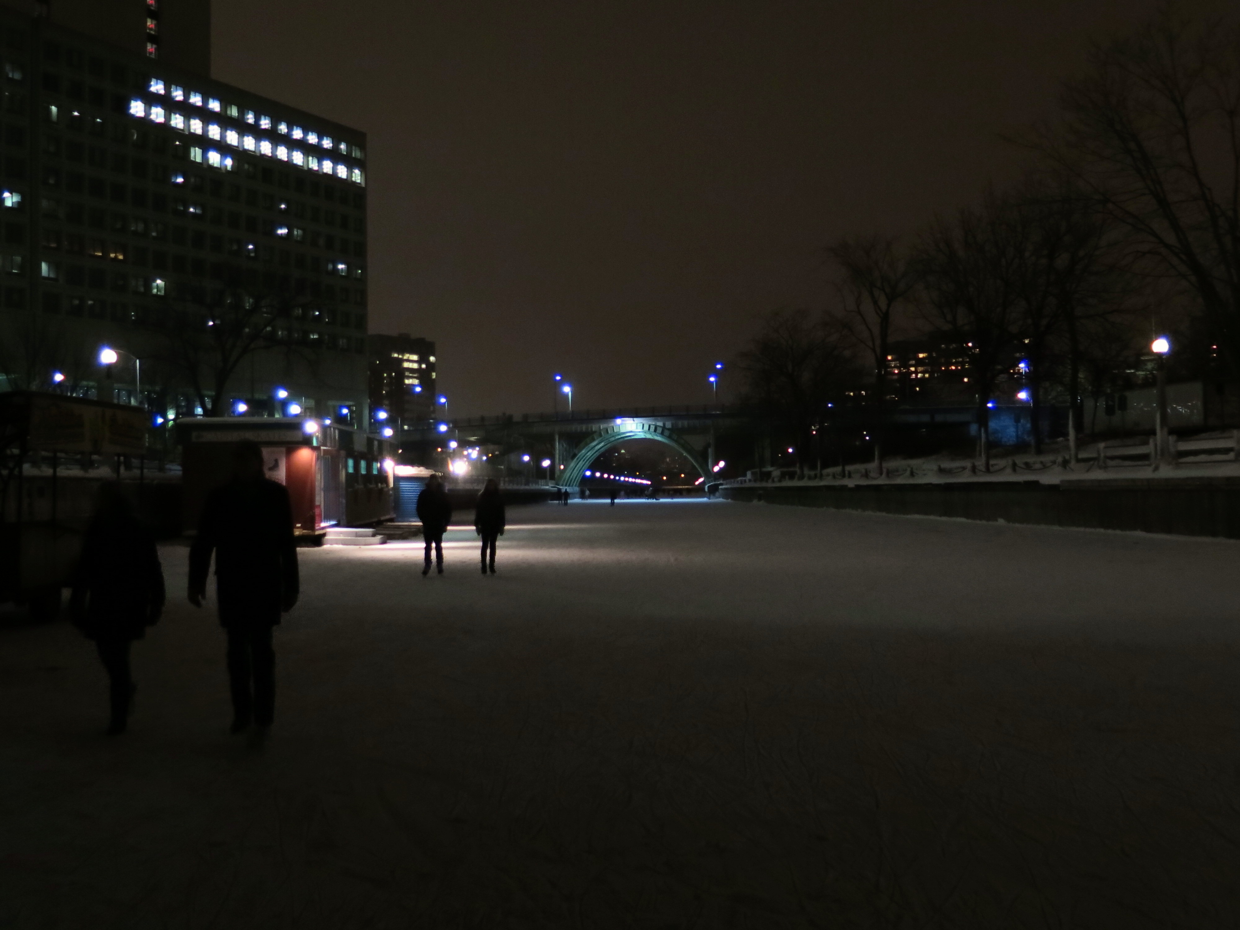 The canal starts in Ottawa and goes upstream and generally southward to Kingston Ontario. Canal’s have locks to allow boats to climb mountains, but after the first set of locks in Ottawa, the canal is flat for around 5 miles and becomes a skating rink in winter. The one lock I saw was frozen shut with just a trickle of water flowing through under the ice.