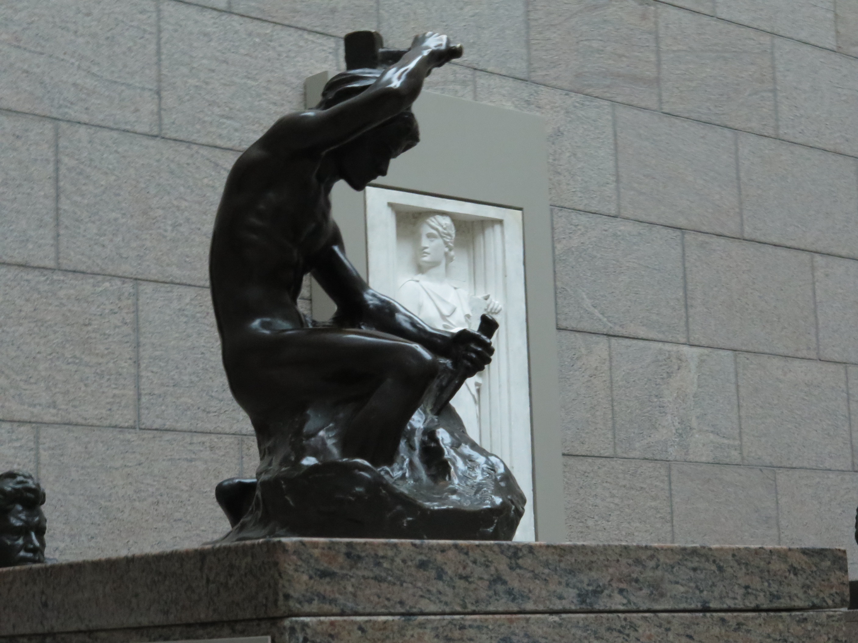 Waiting standing thinking — will the weather change ? That horizon, like a stone bench holds a heavy heaven cloud, but just here the courtyard light streams through the skylight and all seems bright. Bright for now. But what of yesterday too when ringing around with sound of hammer on steel I wandered slowly gazing. A bass clarinet breathing sounds through the parapet. A low sounding solo of calm resigned loneliness talking to the dying day. A furrow grazed his brow as I stood there looking at the far sky.But here I stand today all quiet and mourning the day like it had died already and just waiting,, waiting for the standing thinking time to finish.