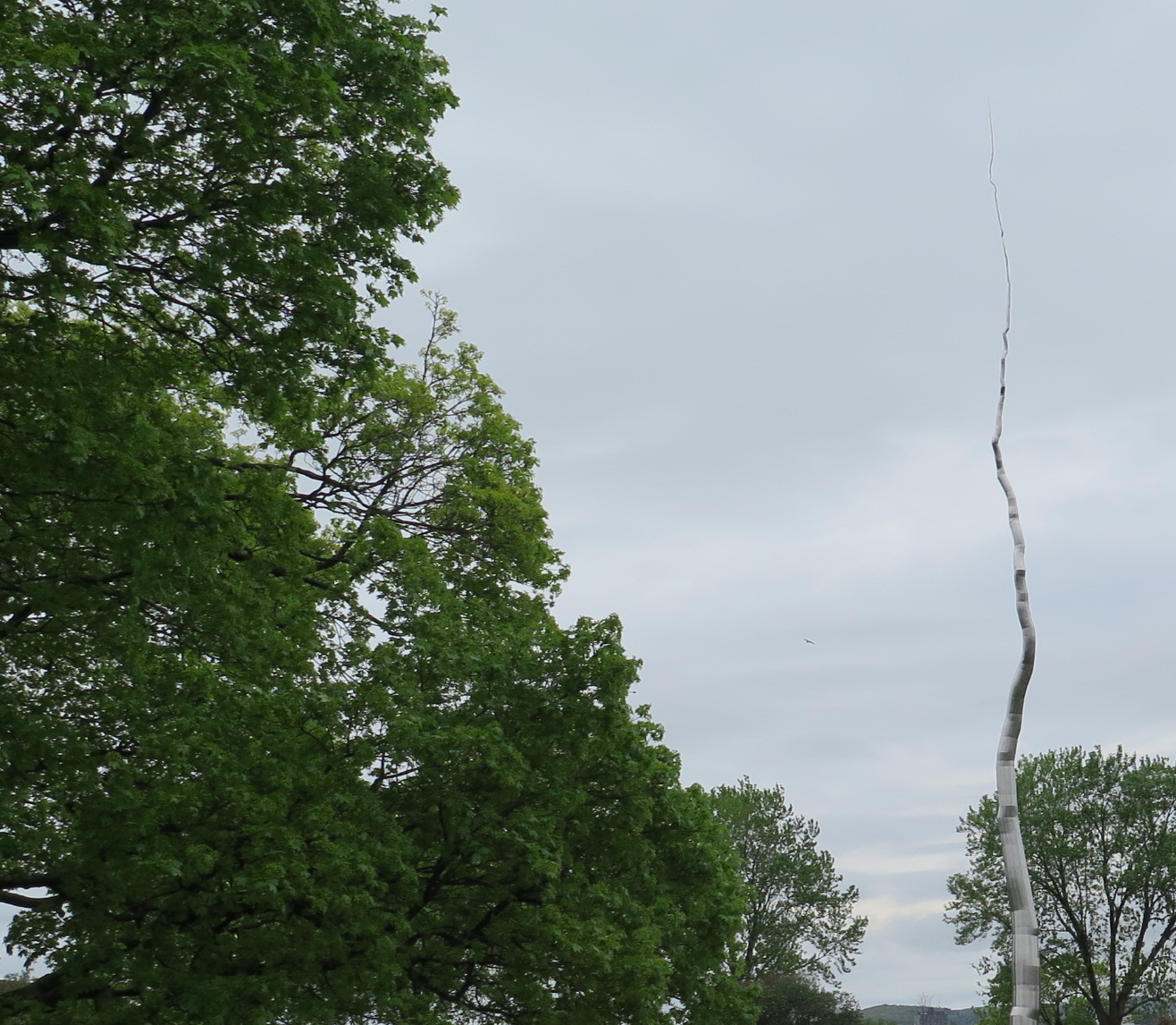 Still the crack itself is not a gap, it’s a thing dividing the brittleness of the scene. I went back there, to the park with the tree in it. And yes, i felt i had to go an touch the metal of the tear in the air, spiking up like lightning in reverse. It was cold and heavy with condensation to touch and I felt no calm with its seemingly infinite jagged height. Made of hardened stainless steel and welded together, it’s permanency in the face of future storms looked assured. The rent in the photo had turned into a real thing. A spire of substance, permanence and worth.