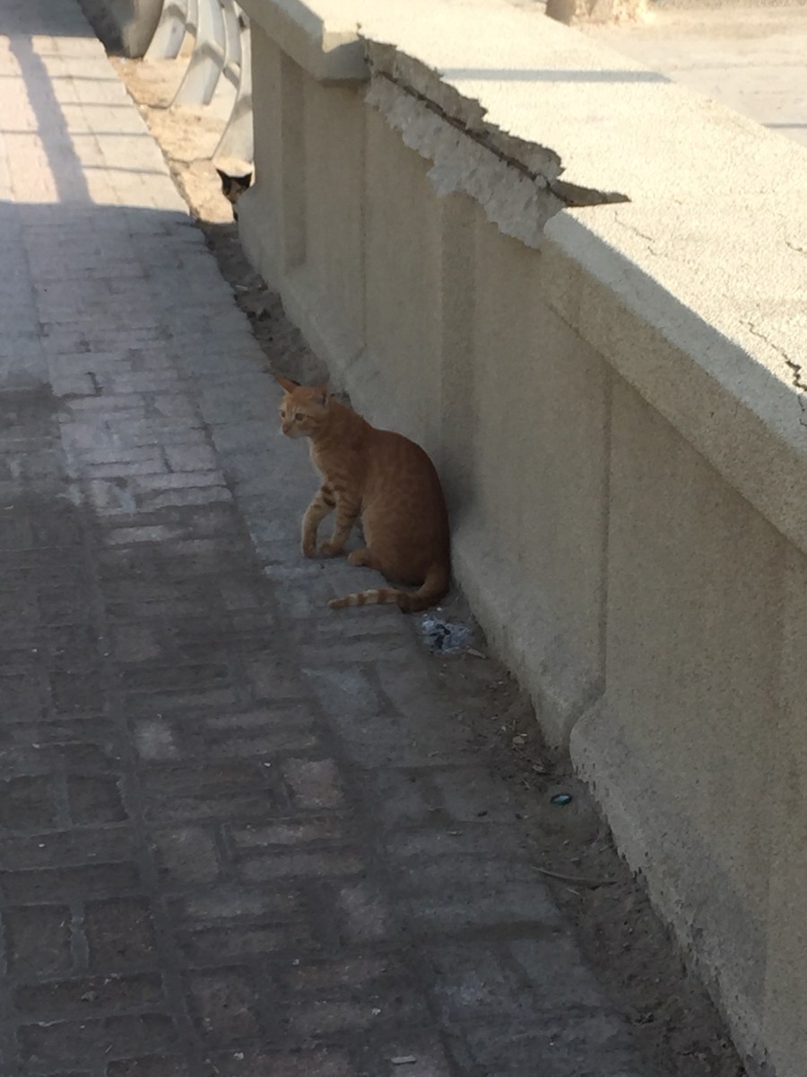 I couldn’t wait – a shore kitten skittish on the rocks took this opportunity to jump up on the Seawall and snaffle the hits of shrimp left lying around. He saw me and scampered off to the cooler shade of the wall.