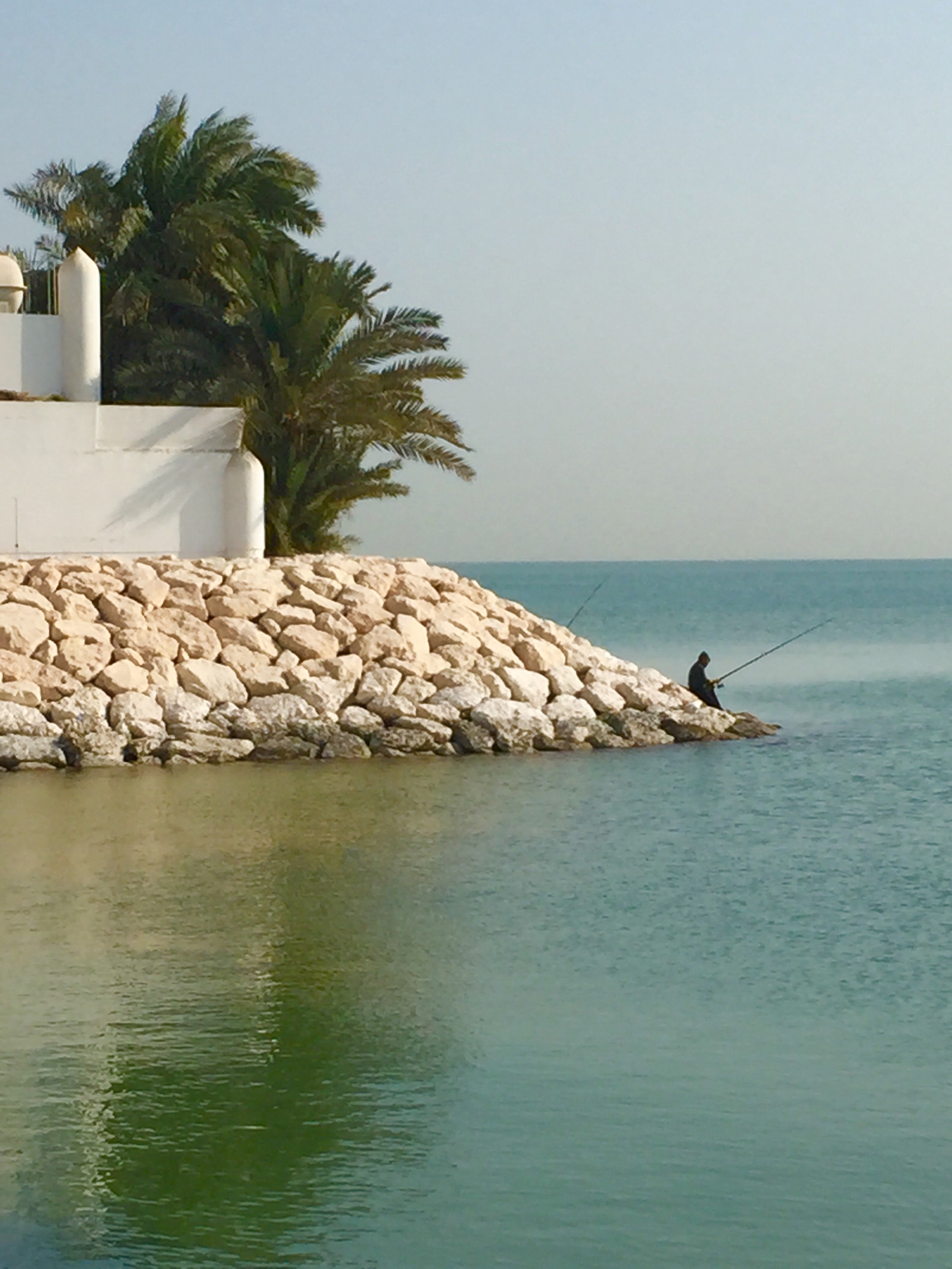 The prawn bait is cut and skewered onto small hooks on a side line up from the large sinker. Shallow ripple water stretches out as far as you can see – sometimes through to the lights of Bahrain on the other side. The rod whips over head and the cast reaches out about 40 meters. It’s heavy enough to provide some tension on the line but ok for a little bream to nibble around and take the bait.